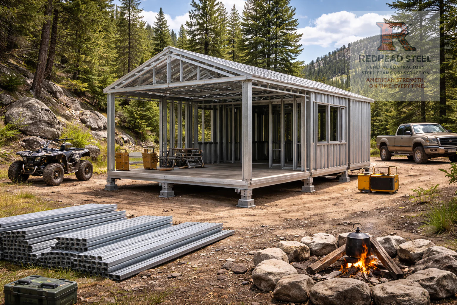 A portable cold-formed steel structure designed for a remote hunting camp in rugged terrain.