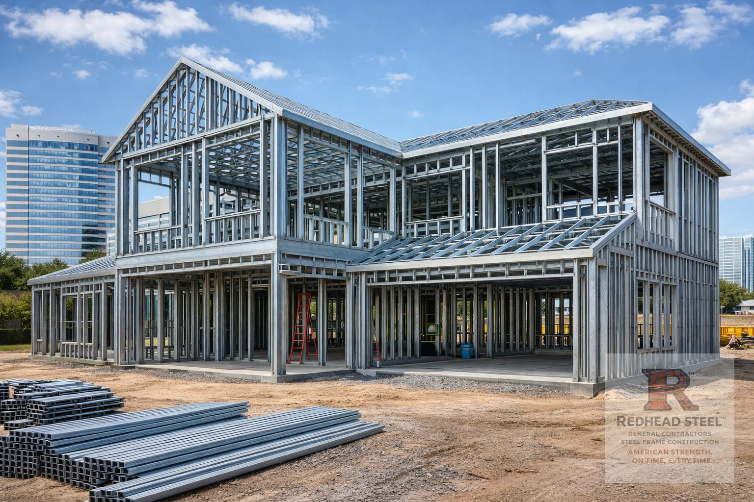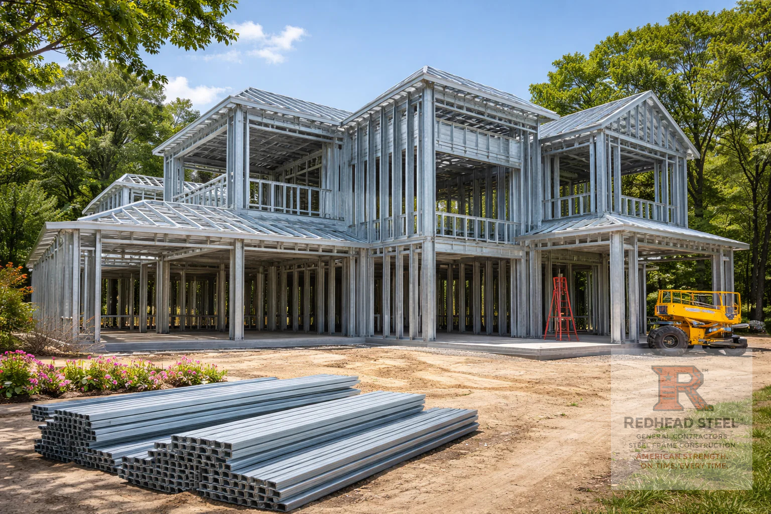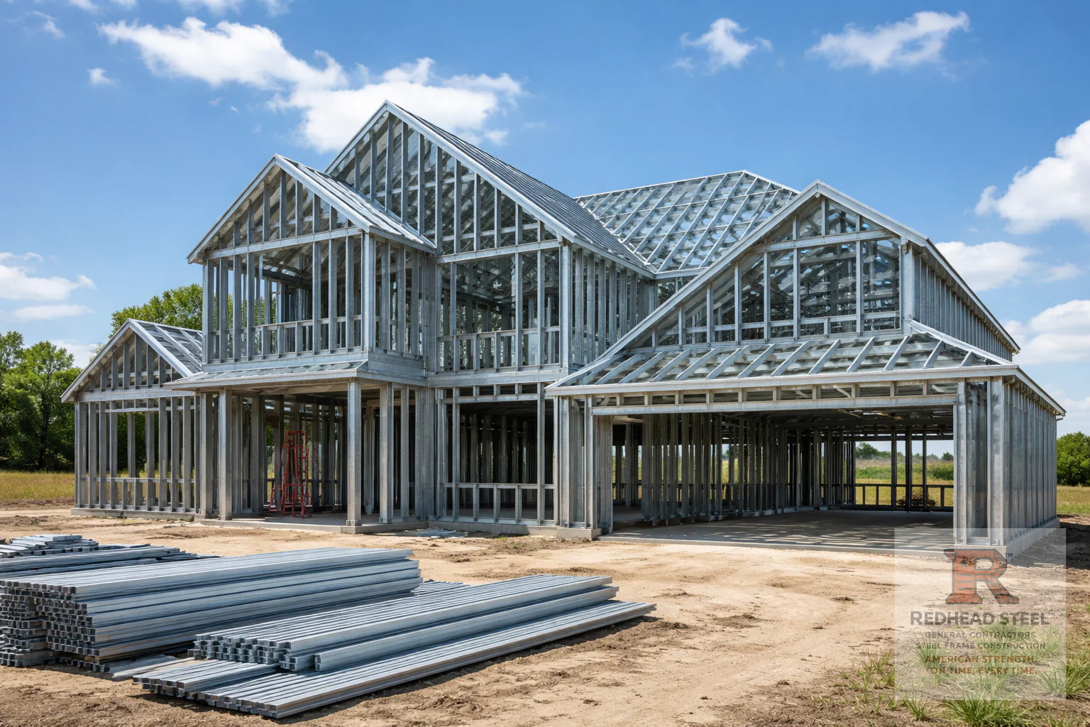 Redhead Steel provided a custom full structure steel frame kit with integrated cold-formed steel trusses, precision-manufactured and delivered significantly faster than traditional wood framing systems.